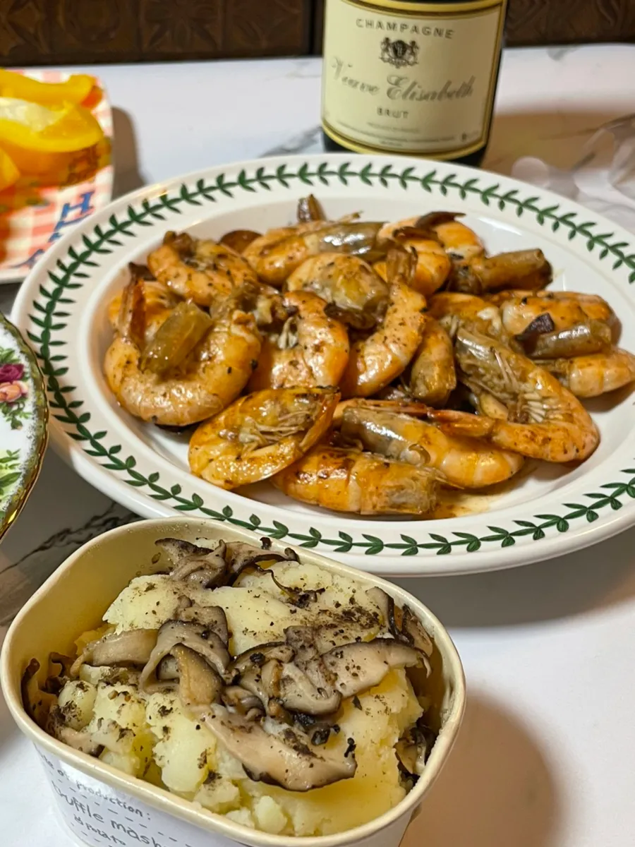 In the evening, champagne and butter-grilled shrimp with Mom,,