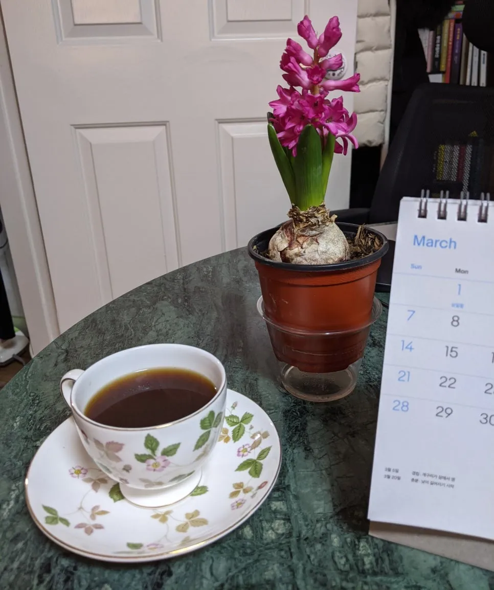 During the day, when I’m deep in work, I placed the hyacinth on the balcony to catch the sun.