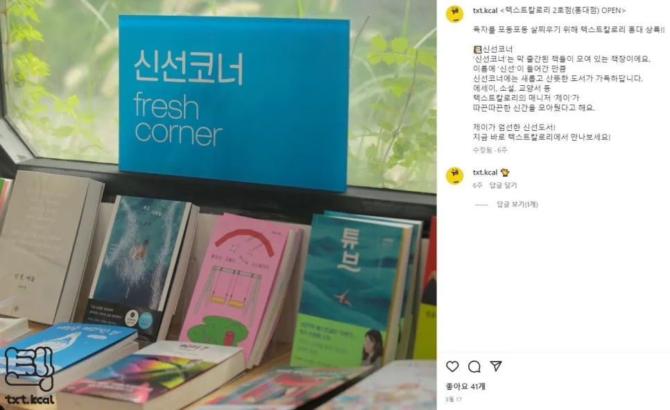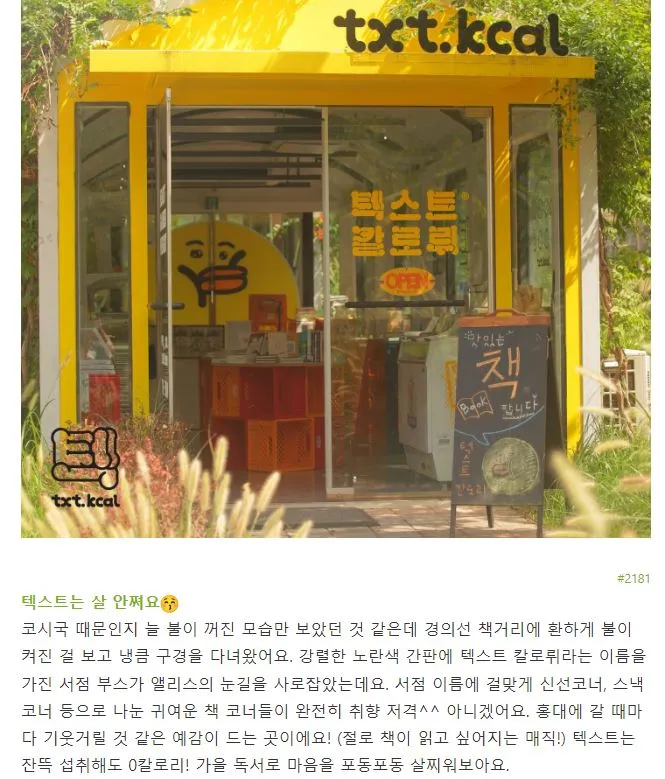 1. “Text Calories” as a bookstore name..! What a cute idea. The way they curated books, comparing them to food with sections like ‘Fresh Corner’ and ‘Snack Corner,’ is also so clever. Autumn, the season for reading, food for the soul, zero calories no matter how much you consume… This kind of vibe is totally my style.