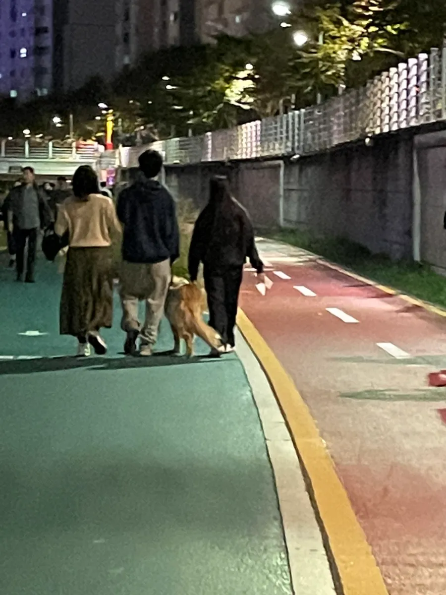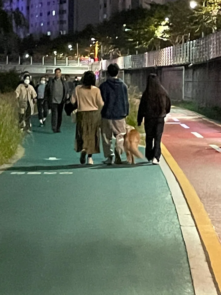 A back view that looks so, so happy during a night walk,,🫶🏻
