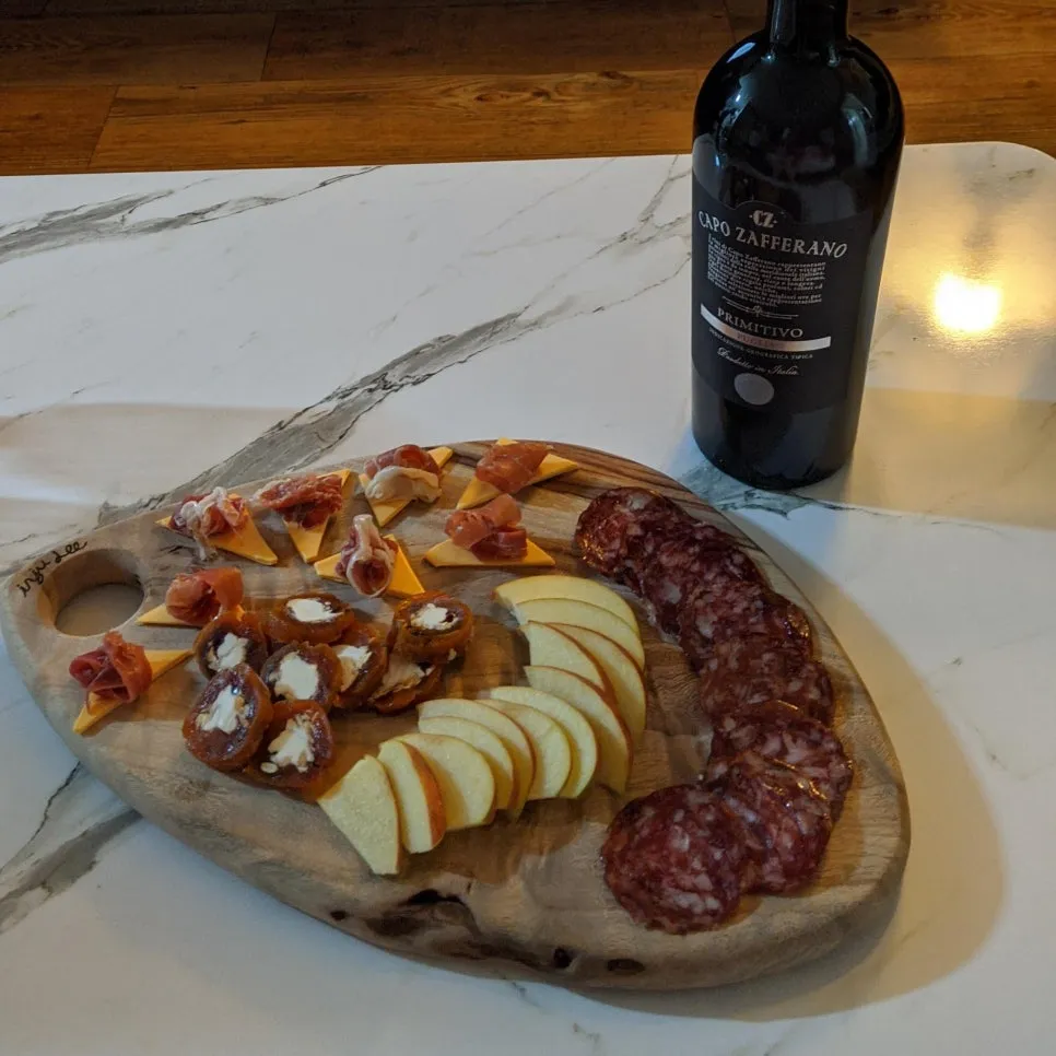 And the first use of this cutting board was for plating jamón and salami hearts, along with dried persimmons stuffed with cream cheese and walnuts made by Mom, to enjoy with wine, hehe.