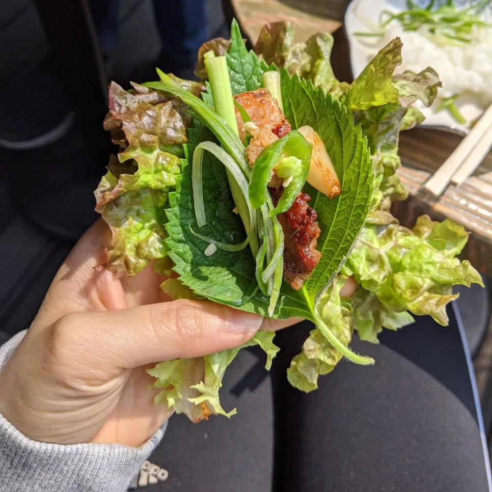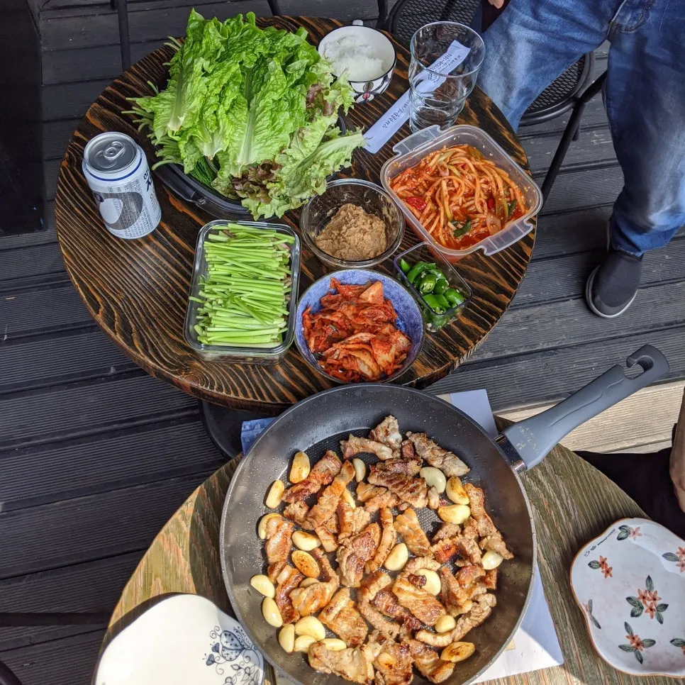 On a nice day, we grilled samgyeopsal for lunch on the terrace. We wrapped it in ssam with fragrant minari.