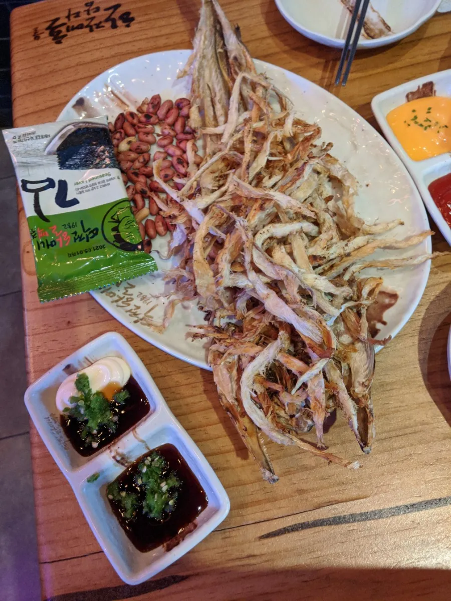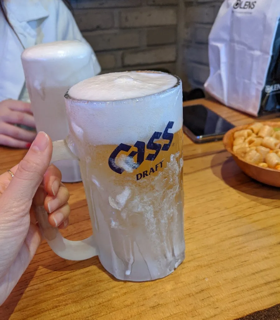 After work, super, super refreshing beer with floating ice shards and meoktae (dried pollock)!
